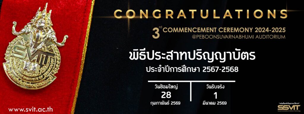 ประชาสัมพันธ์พิธีประสาทปริญญาบัตร ประจำปีการศึกษา 2568 สถาบันสารสาสน์เทคโนโลยีแห่งสุวรรณภูมิ Sarasas Suvarnabhumi Institute of Technology (SSVIT) ขอเชิญบัณฑิตทุกท่าน เข้าร่วม พิธีประสาทปริญญาบัตร และพิธีรับประกาศนียบัตร...