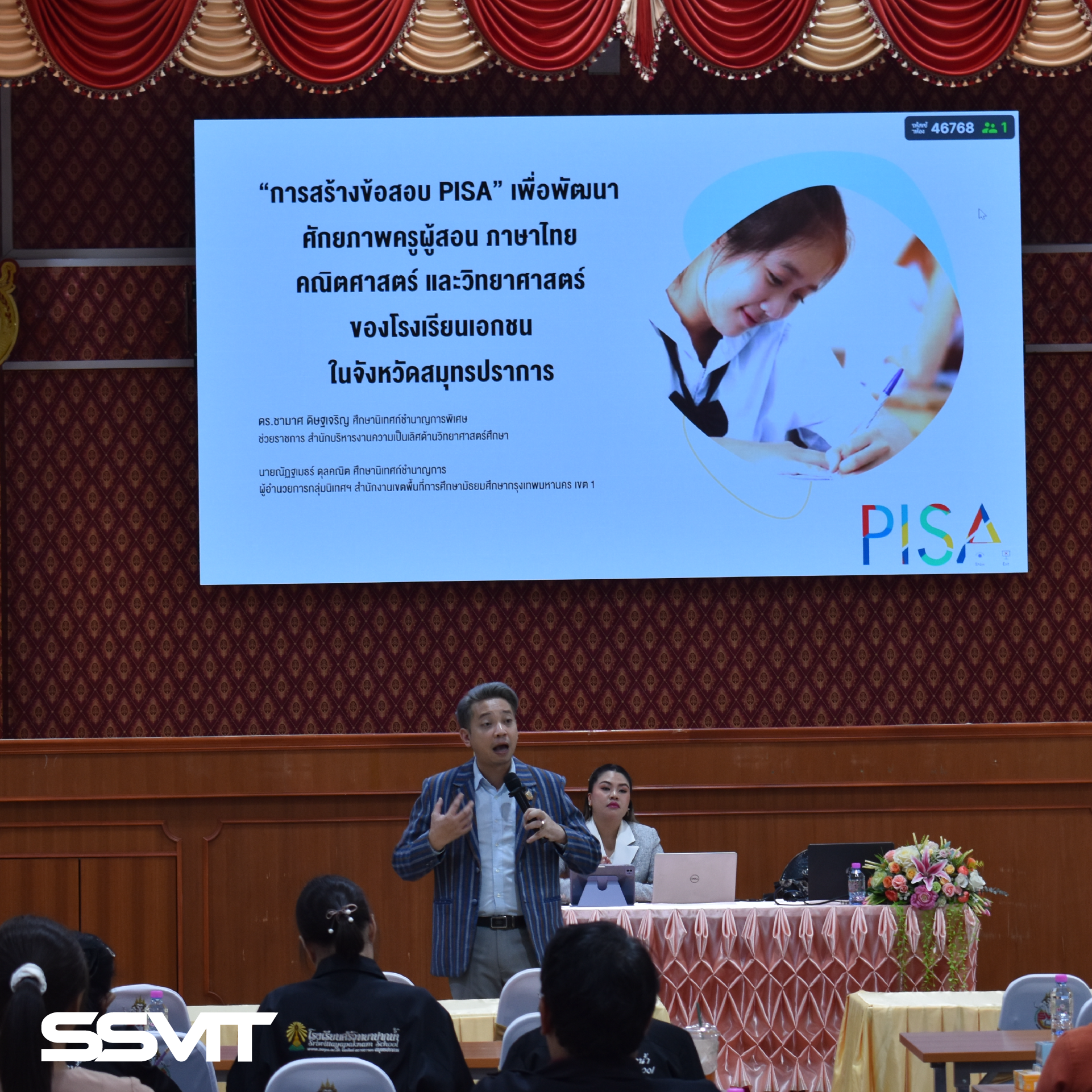 วันที่ 18-19 กุมภาพันธ์ 2568 สถาบันสารสาสน์เทคโนโลยีแห่งสุวรรณภูมิ ร่วมกับ กลุ่มนิเทศติดตามและประเมินผล สำนักงานศึกษาธิการจังหวัดสมุทรปราการ และ โรงเรียนสารสาสน์วิเทศศึกษา แกนนำ PISA จังหวัดสมุทรปราการ จัด “กำหนดการอบรมเชิงปฏิบัติการ “การสร้างข้อสอบ PISA” เพื่อพัฒนาศักยภาพครูผู้สอนภาษาไทยคณิตศาสตร์และวิทยาศาสตร์ระดับชั้น ม.๒ และ ม.๓ โรงเรียนเอกชนในจังหวัดสมุทรปราการ “ ณ หอประชุมพิบูลย์สุวรรณภูมิ สถาบันสารสาสน์เทคโนโลยีแห่งสุวรรณภูมิ การอบรมได้รับเกียรติจาก นางนรินรัชต์ สีแก้วน้ำใส ศึกษาธิการจังหวัดสมุทรปราการ เป็นประธานเปิดงาน พร้อมด้วย ดร.วริศนันท์ เดชปานประสงค์ รองอธิการบดีฝ่ายวิชาการและวิจัย สถาบันสารสาสน์เทคโนโลยีแห่งสุวรรณภูมิ กล่าวต้อนรับ และ นายชัชลินทร์ โยธาทิพย์ นายกสมาคมการศึกษาเอกชนจังหวัดสมุทรปราการ ร่วมในพิธีเปิด โดยมี อุปนายกและกรรมการบริหารสมาคมการศึกษาเอกชนจังหวัดสมุทรปราการ เข้าร่วม การอบรมครั้งนี้ได้รับเกียรติจากวิทยากรผู้ทรงคุณวุฒิ ได้แก่ ดร.ชามาศ ดิษฐเจริญ ศึกษานิเทศก์ชำนาญการพิเศษ นายณัฏฐเมธร์ ดุลคนิต ปฏิบัติหน้าที่ผู้อำนวยการกลุ่มนิเทศ ติดตาม และประเมินผล สพม.1 โดยเนื้อหาอบรมครอบคลุมหลักการสร้างข้อสอบ PISA การวิเคราะห์ตัวอย่างข้อสอบ และเวิร์กชอปการออกแบบข้อสอบใน 3 วิชา ได้แก่ ภาษาไทย คณิตศาสตร์ และวิทยาศาสตร์ พร้อมการนำเสนอและอภิปรายแนวทางการนำไปใช้